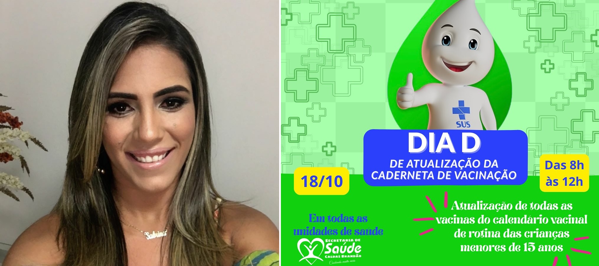 A Prefeitura Municipal de Caldas Brandão, por meio da Secretaria Municipal de Saúde, que tem à frente a secretária Sabrina Rolim, comunica a toda a população que, no próximo sábado, 18 de outubro, das 8h às 12h, será realizado o Dia D de Atualização da Caderneta de Vacinação.