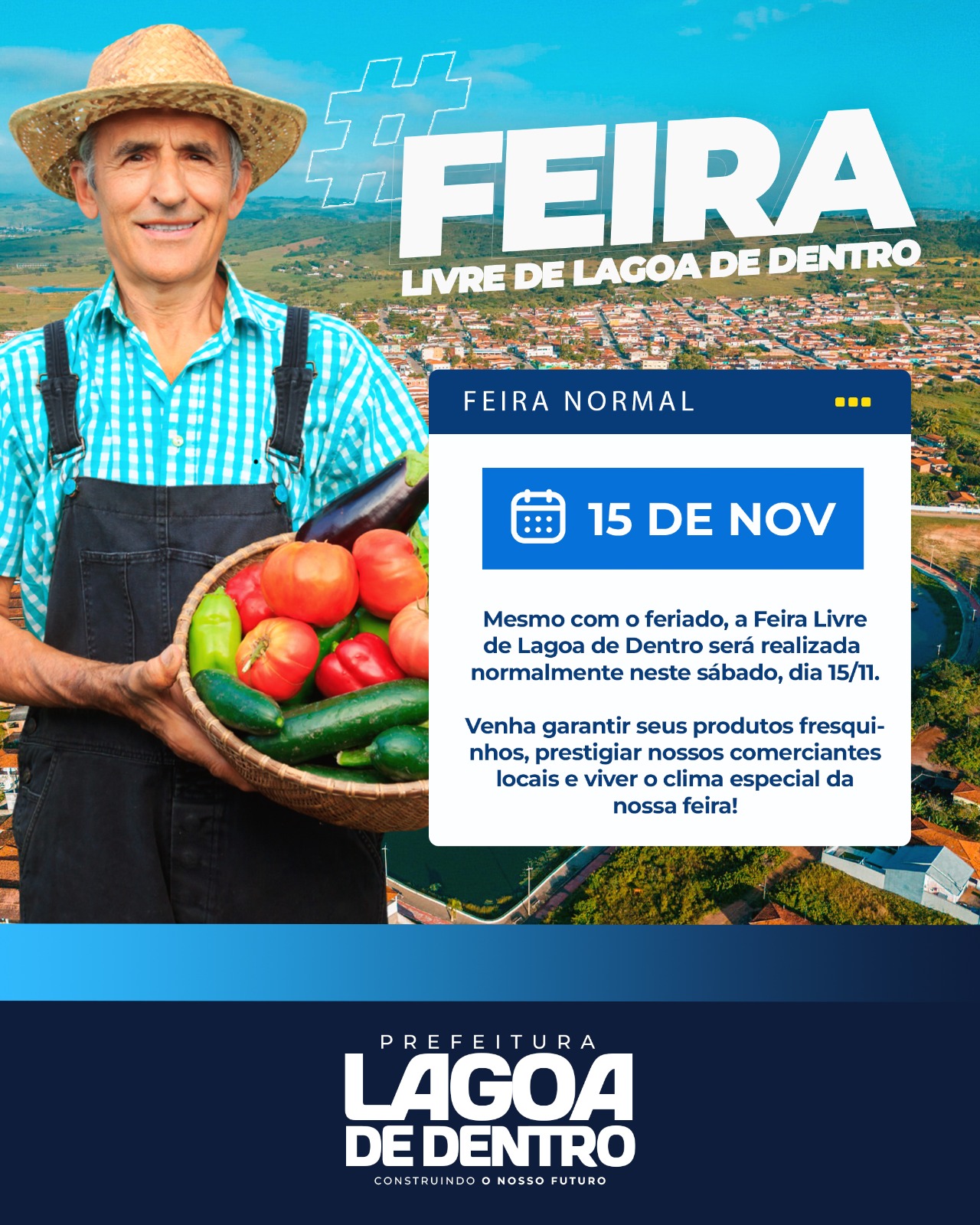 A Prefeitura Municipal de Lagoa de Dentro informa aos feirantes e à população que a Feira Livre será realizada normalmente neste sábado, dia 15 de novembro, mesmo com o feriado nacional.