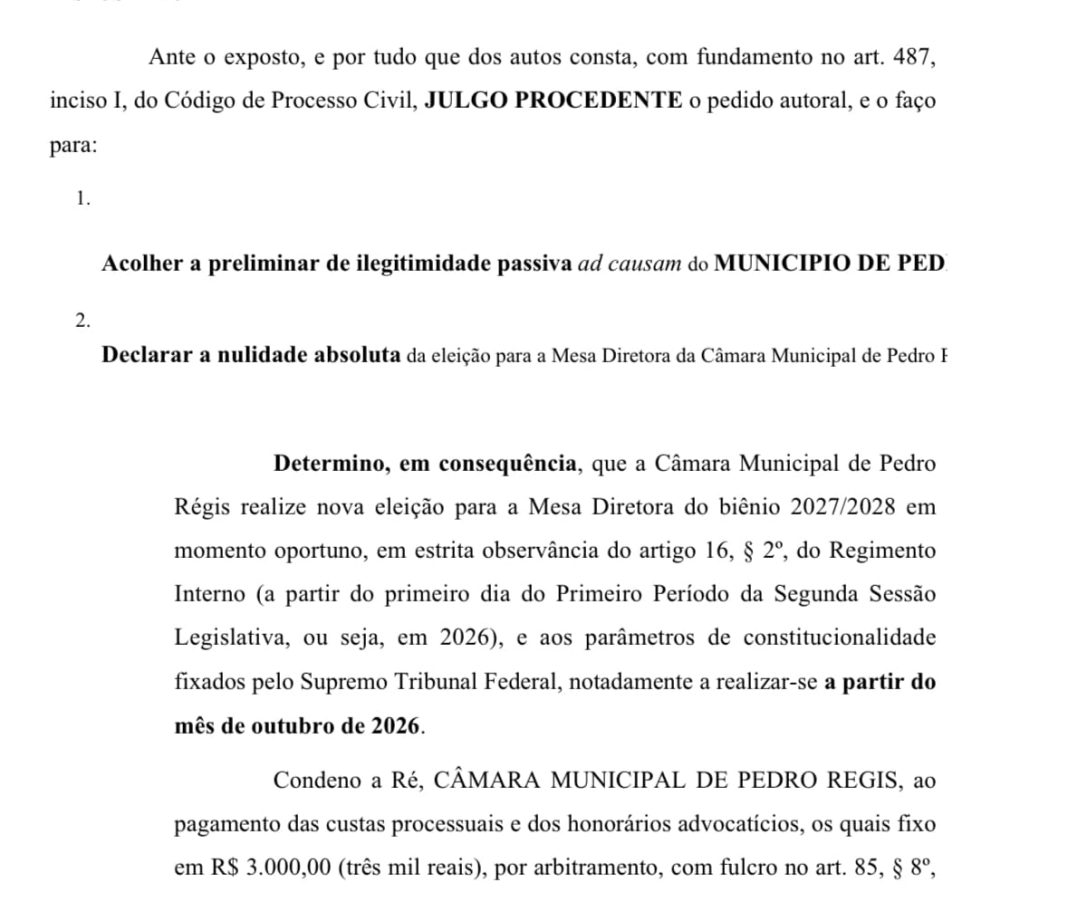 O juíz Eduardo Barros da comarca de Jacaraú, decidiu por derrubar a eleição da mesa diretora da câmara municipal de Pedro Régis, litoral norte da Paraíba, para o biênio 2027 a 2028 que tinha sido antecipada.