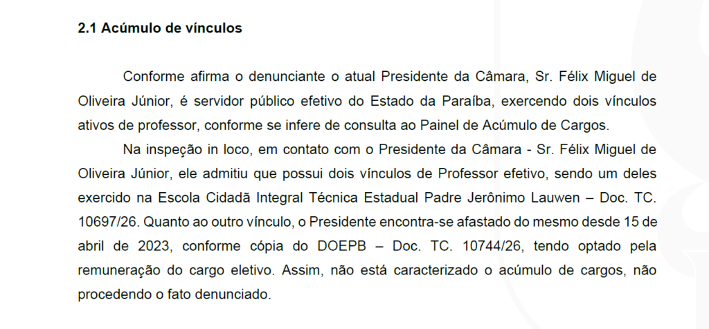 Após inspeção in loco realizada entre os dias 19 e 23 de janeiro de 2026, os técnicos do Tribunal constataram que, embora Félix Júnior possua dois vínculos efetivos como professor, ele está formalmente afastado de um deles desde abril de 2023 e optou por receber apenas a remuneração do cargo eletivo.
